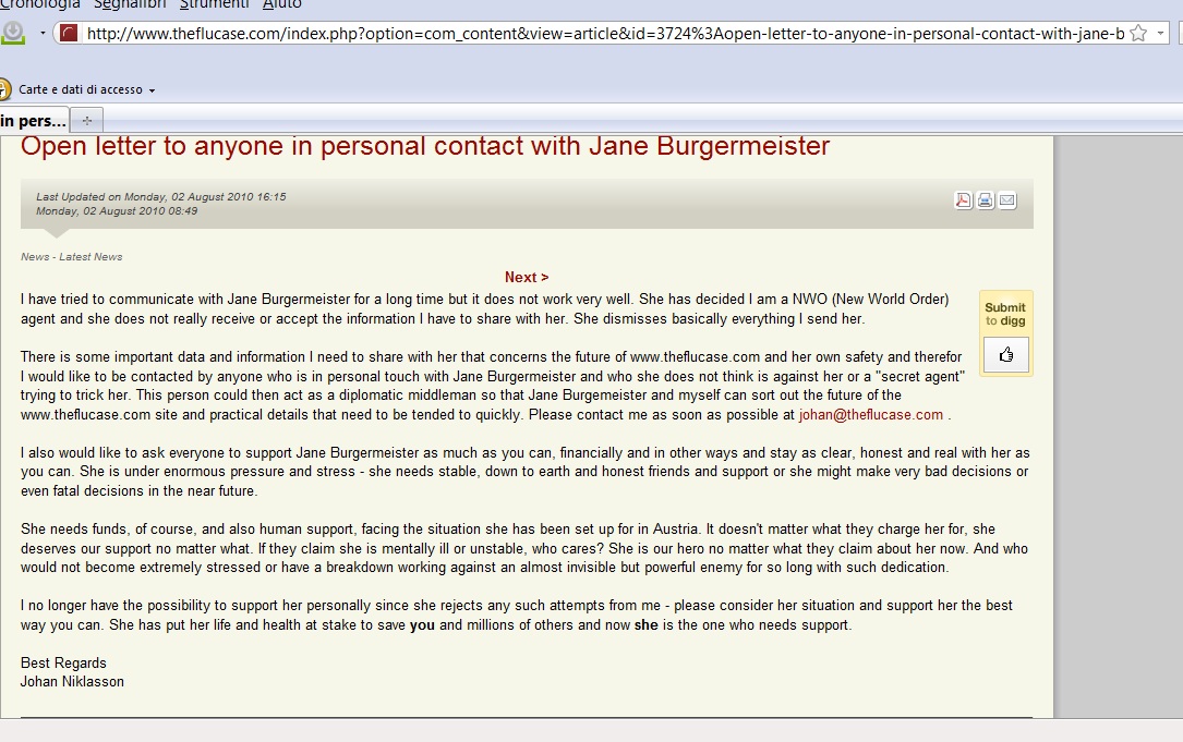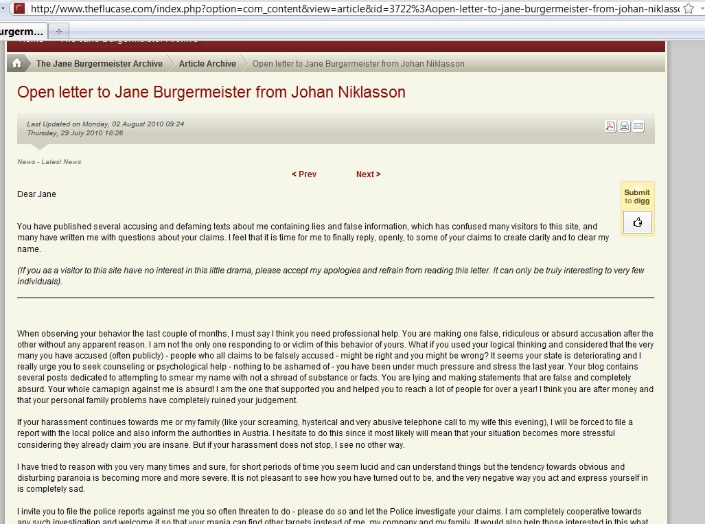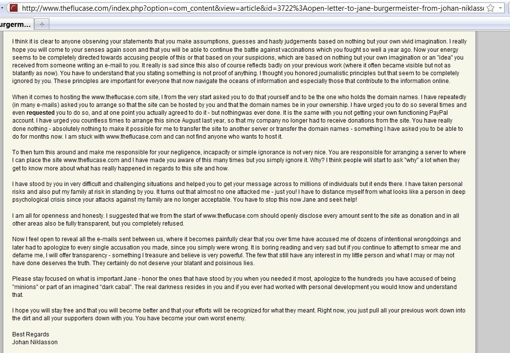 In un primo primo articolo dal titolo "Lettera aperta a Jane Burgermeister" l’ex suo collaboratore J. Niklasson, proprio nel momento in cui la giornalista viene perseguita come "mentalmente incapace " (uno sporco stratagemma governativo per chiuderle la bocca) non si perita di offendere la povera Jane facendo credere che ella sia ammattita. Che chiaro e lucido esempio di difensore delle libertà civili! Nel momento in cui ella avrebbe bisogno del sostegno di tutti, il suo ex collaboratore le da pubblicamente della matta portando acqua al mulino della nuova santa inquisizione.