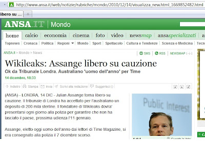 Ma torniamo ad Assange, quell’uomo cui l’arresto ha fatto una pubblicità immensa tanto che, ci avvisa l’ANSA in un suo stringato dispaccio, è stato eletto uomo dell’anno dalla rivista britannica Time. L’arresto quindi gli è valso persino un tangibile riconoscimento e la pubblicità che è stata fatta dal sistema che lo ha astutamente arrestato (per una settimana appena!) per poi farne un eroe metterà sempre più sotto i riflettori le sue "rivelazioni" che come abbiamo già visto sono utili ad Israele e, nonostante le apparenze, anche agli USA per giustificare guerre presenti e future nel Medio Oriente.