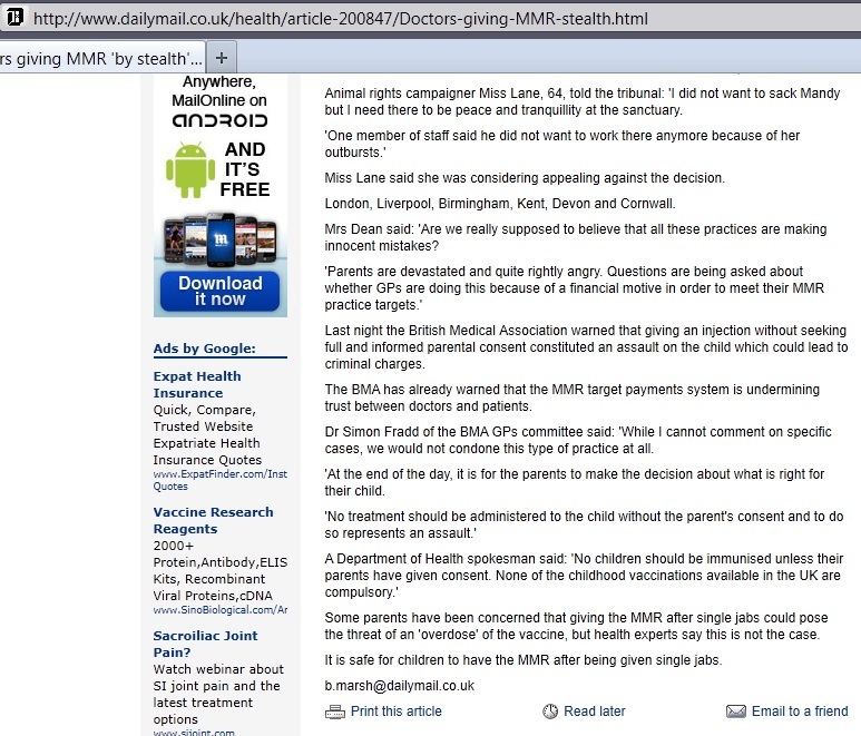 La notizia appare sull’edizione on line del dailymail (Doctor -giving MMR ‘by stealth‘):