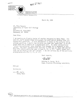 Il giorno 26 marzo 1984 il dr. Gonda, che venne incaricato da Gallo e assistenti di fotografare il “virus” al microscopio elettronico al fine di inviare le immagini alla rivista Science per la sua pubblicazione, scrive a Gallo e alla sua équipe che: “…le particelle osservate sono frammenti di una cellula degenerata” e che “….non credo affatto che le particelle fotografate siano il virus HTLV (HIV)”.