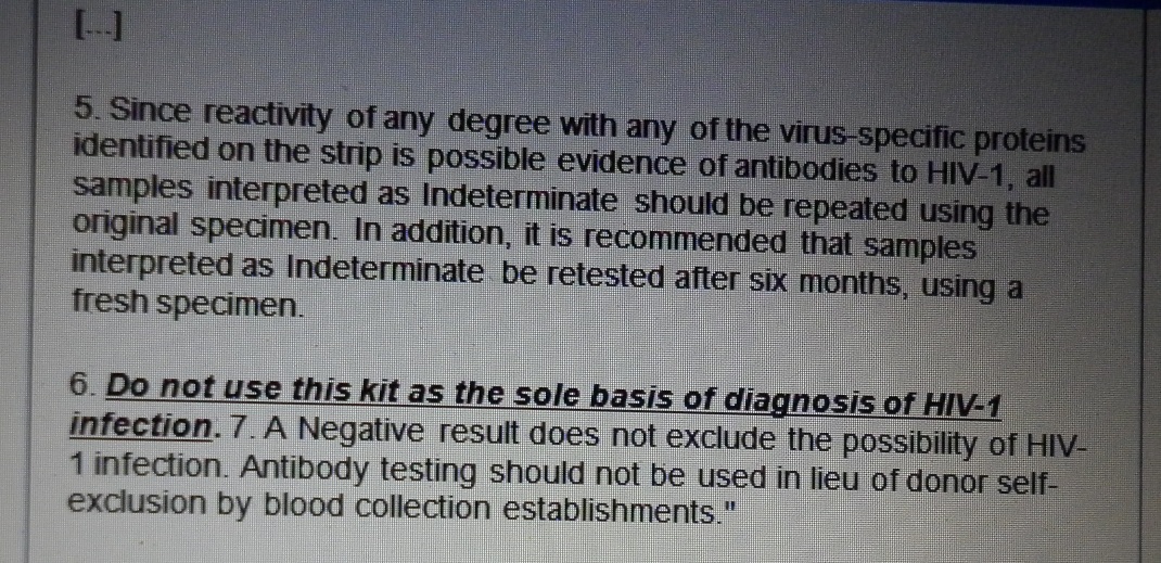 5. Since reactivity of any degree with any of the virus-specific proteins identified on the strip is possible evidence of antibodies to HIV-1, all samples interpreted as Indeterminate should be repeated using the original specimen. In addition, it is recommended that samples interpreted as Indeterminate be retested after six months, using a fresh specimen.