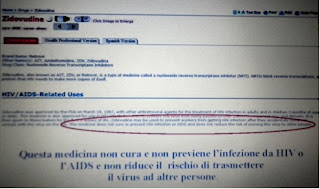 “QUESTO FARMACO NON CURA E NON PREVIENE L’INFEZIONE DA HIV E NON NE IMPEDISCE LA TRASMISSIONE. QUESTO FARMACO PUO’ CAUSARE, CON I SUOI EFFETTI COLLATERALI, GLI STESSI SINTOMI DELLA IMMUNODEFICIENZA ACQUISITA (AIDS)”.