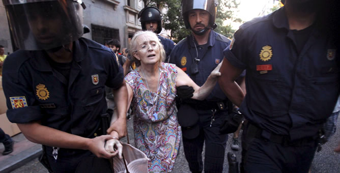 MADRID – Il 14 luglio migliaia di manifestanti si sono riversati nelle strade del centro di Madrid per protestare contro il pacchetto delle nuove misure di austerity contenute della manovra da 65 miliardi appena varata dal governo: aumento di 3 punti dell’Iva, taglio del 100% alle tredicesime, meno ferie ai dipendenti pubblici e taglio all’indennità di disoccupazione. I manifestanti si erano dati appuntamento davanti al quartier generale del Partido popular (Pp) del capo e del governo Mariano Rajoy per protestare e chiedere un referendum popolare che abrogasse le misure di macelleria sociale ma quando il corteo si è diretto verso la sede del Partito socialista (Psoe), la polizia in assetto anti-sommossa lo ha bloccato con cariche e lancio di lacrimogeni. Qualche giorno prima le forze dell’ordine avevano sparato proiettili di gomma ad altezza d’uomo contro le rivendicazioni dei minatori sui tagli ai sussidi.